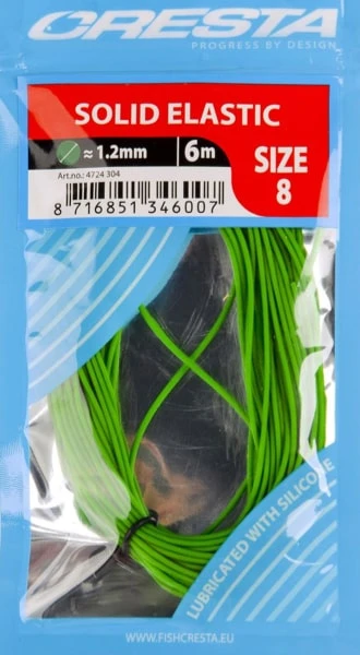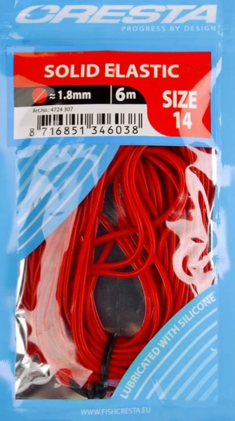 Dit slijtvaste, gekleurde latex elastiek is de juiste keuze voor zowel de competitievisser als de recreant. Dankzij de zeer herkenbare, verschillende kleuren is het elastiek goed te volgen tijdens de dril en is het gemakkelijk om de diverse diameters te herkennen. Door het weglaten van een winder staat er geen spanning op het elastiek, waardoor de kwaliteit langdurig gegarandeerd blijft. De toegevoegde vloeibare siliconen zorgt voor een soepel verloop door de top. Cresta Solid Elastic wordt geleverd in een lengte van 6 meter, wat voldoende is voor 2 tot 3 hengeltoppen. Verkrijgbaar in 8 verschillende maten van 0.8 t/m 2.1mm. Voor allround gebruik voor witvis en karper.