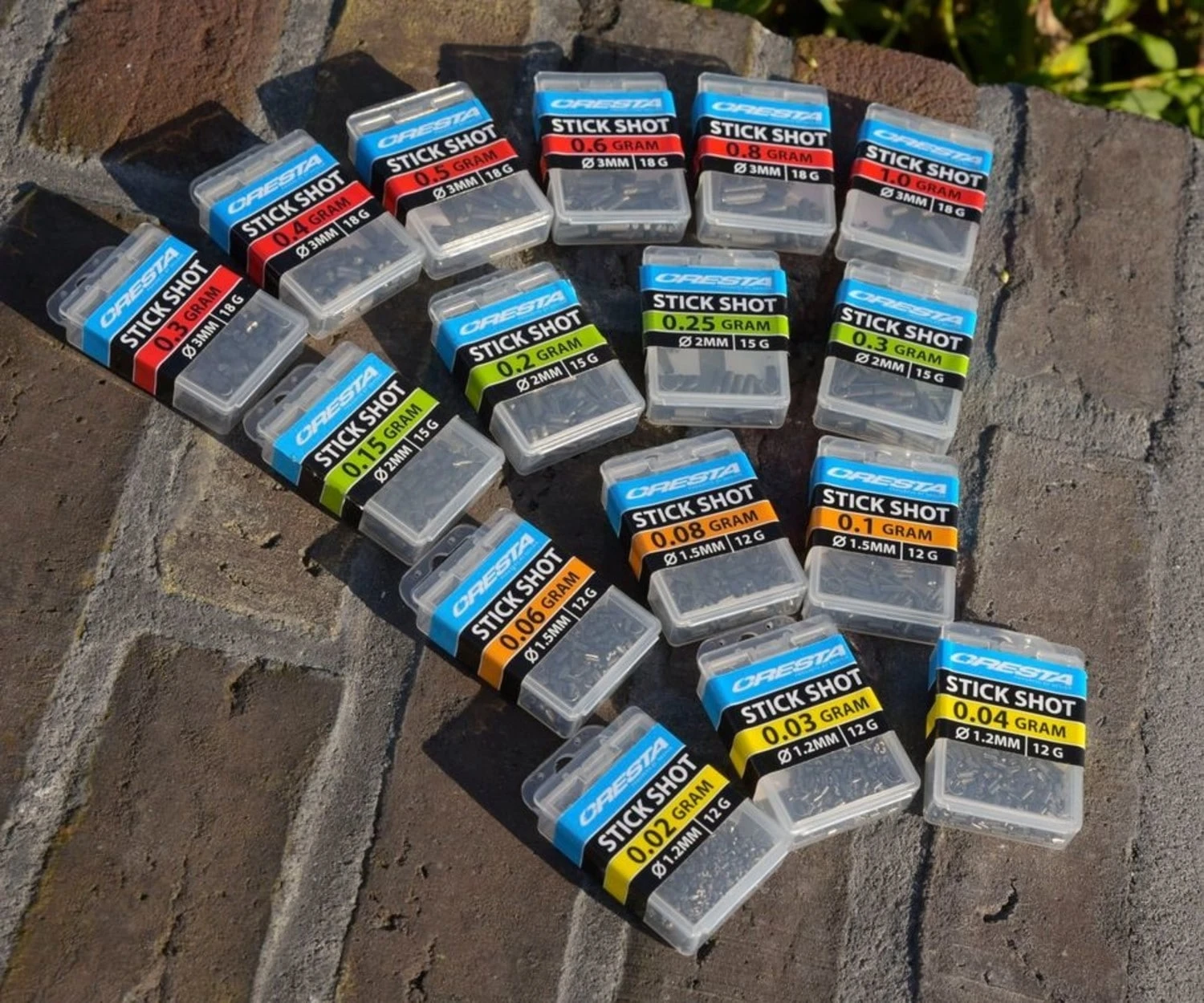 Deze Cresta Stickshots helpen je bij het eenvoudig uitloden van elk dobber. Dankzij de aanduiding in gewicht i.p.v. van nummers is het selecteren van het juiste loodje zeer eenvoudig. De juiste zachtheid en de perfect gecentreerde snede zorgen ervoor dat Stickshots gemakkelijk op zowel dunne als dikkere lijnen te fixeren zijn , zonder dat deze hierdoor beschadigen. De langwerpige vorm zorgt voor extra grip op de lijn, waardoor ze tijdens het vissen niet of nauwelijks verschuiven. De slanke vorm zorgt voor een geleidelijke en zeer natuurlijke manier van afzinken. Dit alles maakt Stickshots zeer geschikt voor de traditionele visserij op witvis en de karpervisserij op commercials. Stickshots zijn verkrijgbaar in 16 verschillende maten van 0,02 t/m 1,0gr, zodat altijd een optimale loodzetting bereikt kan worden.
