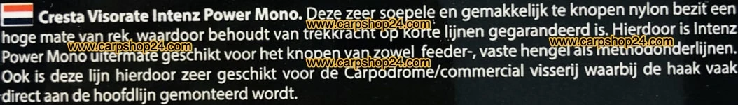 Deze zeer soepele en gemakkelijk te knopen nylon bezit een hoge mate van rek, waardoor behoudt van trekkracht op korte lijnen gegarandeerd is. hierdoor is Intenz Power Mono uitermate geschikt voor het knopen van zowel feeder-, vaste hengel als methodonderlijnen. Ook is deze lijn hierdoor zeer geschikt voor de Carpodrome/commercial visserij waarbij de haak vaak direct aan de hoofdlijn gemonteerd wordt.