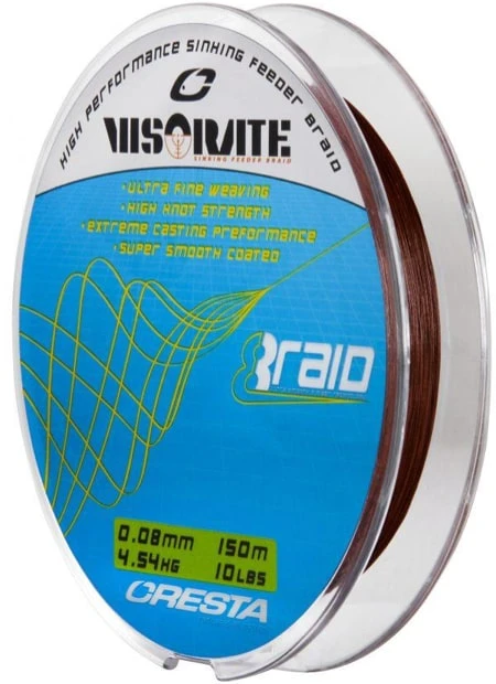 Deze nieuwe Cresta gevlochten draad is door Cresta speciaal ontwikkeld voor het feedervissen. Visorate Braid is gevlochten met 8 strengen. Dit maakt de lijn praktisch rond. De lijn is voorzien van een zogenaamde PE-coating, waardoor de lijn een extreem glad oppervlak krijgt. De gebruikte vezels zijn geproduceerd in Japan en garanderen een hoge slijtvastheid en langdurig gebruik. VISORATE Braid bezit een zeer onopvallende kleur bruin en wordt geleverd op spoelen van 150m in zowel 0.08 als 0.10mm.