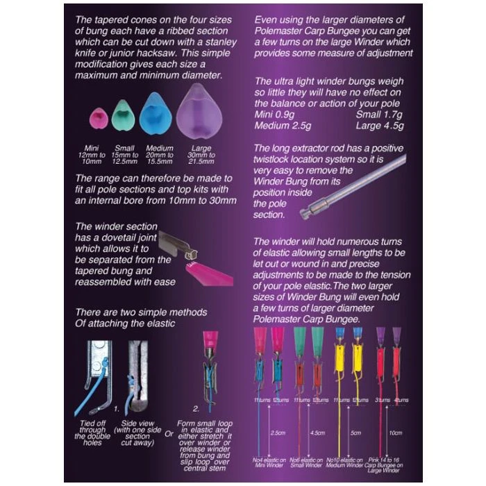 Geproduceerd in een extra sterk, ultralicht materiaal, passen de vier maten Polemaster Winder Bungs op een zeer breed scala aan topsecties.