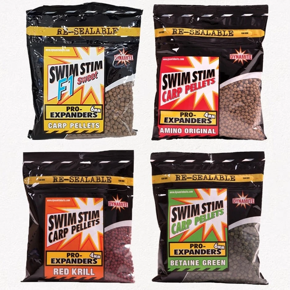 Alle aantrekkingskracht van SwimStim in de vorm van expanderpellets. Vier smaken met elk twee maten – 4 en 6 mm. Betaine Green, Krill, Amino Original & F1 Sweet