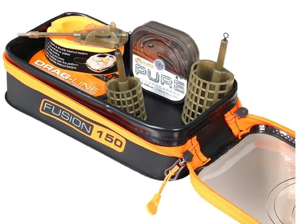 Deze uitgebreide range van opbergtassen en bait bowls mag bij geen enkele visser meer ontbreken! De tassen zijn allemaal gemaakt van hoogwaardig EVA materiaal dat 100% waterdicht is. Daarnaast zijn de Fusion 110, 150, 210, 400, 420, 800 en Catapult Bag voorzien van een handige getinte deksel welke eenvoudig dicht geritst kan worden om zo kostbaarheden of aas tegen weer en wind te beschermen.