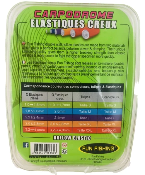 De holle elastieken van Fun Fishing zijn gemaakt van bi-materiaal (dubbele wanden) en bieden een perfect compromis tussen kracht en demping. Door hun uitzonderlijke rekvermogen zijn ze veel beter bestand tegen breuk dan volledige elastiekjes, waardoor grotere karpers sneller onder de knie kunnen worden.