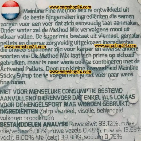 Mainline Fine Method Mix is ontwikkeld uit de beste fijngemalen ingrediënten die samen zorgen voor een voer dat zich eenvoudig laat aanmaken. Onder water zal de Method Mix vervolgens mooi uit elkaar vallen. De super mix bestaat uit vismeel, gemalen pellets en diverse zorgvuldig uitgekozen ingrediënten die onweerstaanbaar zijn voor karper en diverse andere soorten vis! De Method Mix laat zich prima op zichzelf gebruiken, maar is naar wens ook te combineren met de Match Activated Coarse Pellets en de Match Activated Carp Cell Pellets. Door een kleine hoeveelheid Mainline Sticky Syrup toe te voegen kan je het voer naar wens fine tunen.