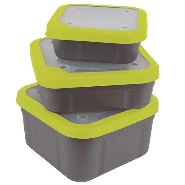 Verkrijgbaar in 3 maten, 1.1pt, 2.2pt & 3.3pt. De nieuwe aasdozen zijn perfect om levend aas vers te houden dankzij het ademende, gemakkelijk te plaatsen rubberen verzegelde deksel. De deksels zijn ook doorschijnend om een snelle identificatie van de inhoud mogelijk te maken en zijn gemaakt van een schokbestendig, slijtvast plastic.