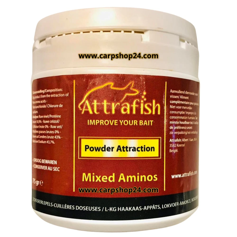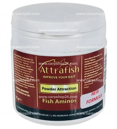 Powder Attraction Fish Aminos, de stinker uit het gamma, combinatie van een visaroma en visextract met hoge concentratie aan aminozuren.
