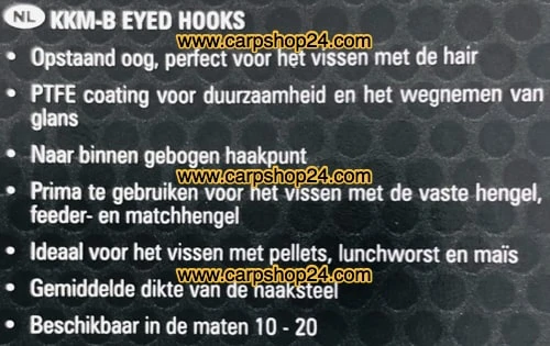 De KKM-haken zijn de ultieme haken voor het vissen met de hair. Het naar buiten gebogen oog is een opvallend kenmerk, door de hoek waarmee de haak aan de lijn hangt dringt de haak beter in en schieten er minder gehaakte vissen los. Perfect voor het vissen met de voerkorf en de waggler in combinatie met talloze aassoorten, zoals pellets, lunchworst, BandโUms, maรฏs etc.