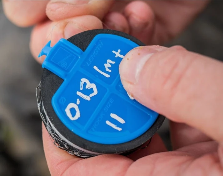 Er is ruimte op de spoel waarop het type onderlijn aangegeven kan worden kan worden, hierop kan de lengte van de onderlijn, de diameter van de lijn, haaktype en -maat omschreven worden.